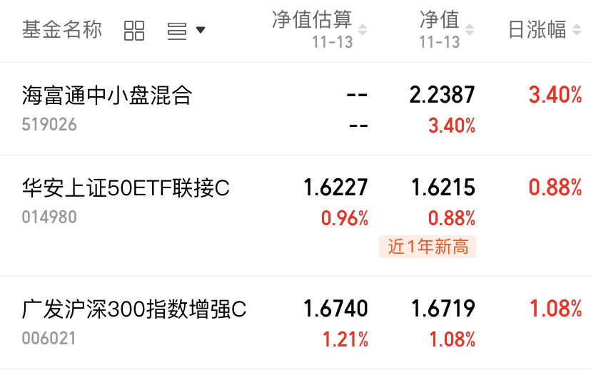 今天上涨的行情牛味十足,并且创了10年新高,市场的信心非常大,中小盘反弹的力度更好一些,$海富通中小盘混合(OTCFUND|519026)$上涨3.40%,$华安上证50ETF联接C(OTCFUND|014980)$上涨0.88%,$广发沪深300指数增强C(OTCFUND|006021)$上涨1.08%。