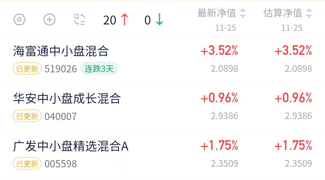 $华安中小盘成长混合(OTCFUND|040007)$上涨0.96%$广发中小盘精选混合A(OTCFUND|005598)$上涨1.75%