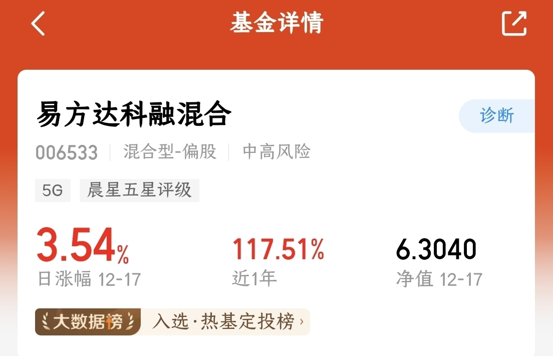 最近股市震荡,行情分化,操作比较难。在震荡市场中均衡配置更具抗风险能力。易方达科融混合持有新能源与AI等赛道,昨天上涨3.54%,表现亮眼。分散持仓优于单押单一领域,有助于平衡收益与风险。