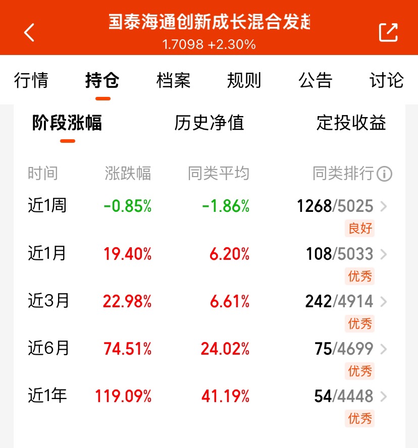 震荡市场嘛这样的行情挺常见,国泰海通创新成长一年收益率 + 119%,看着挺稳的。