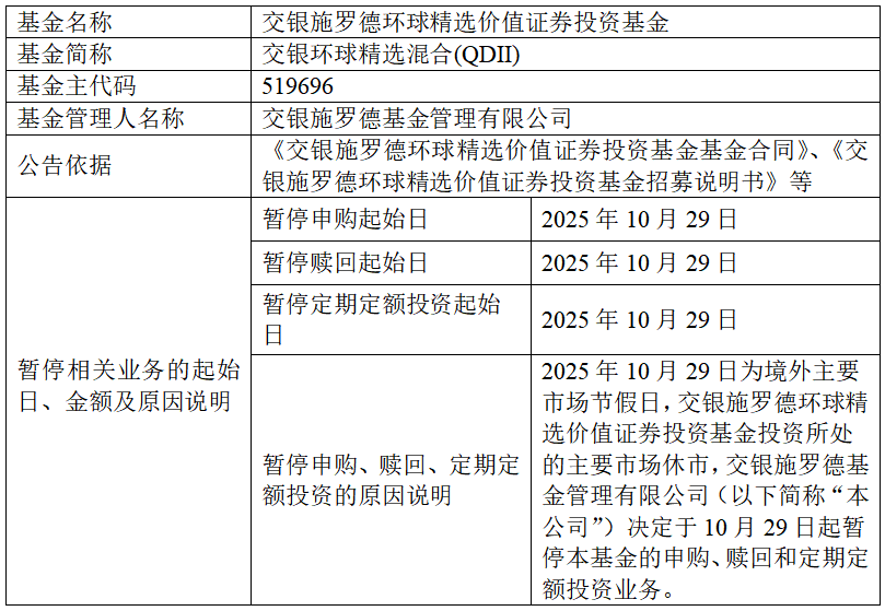 10月29日交银环球暂停交易及节后恢复交易的公告