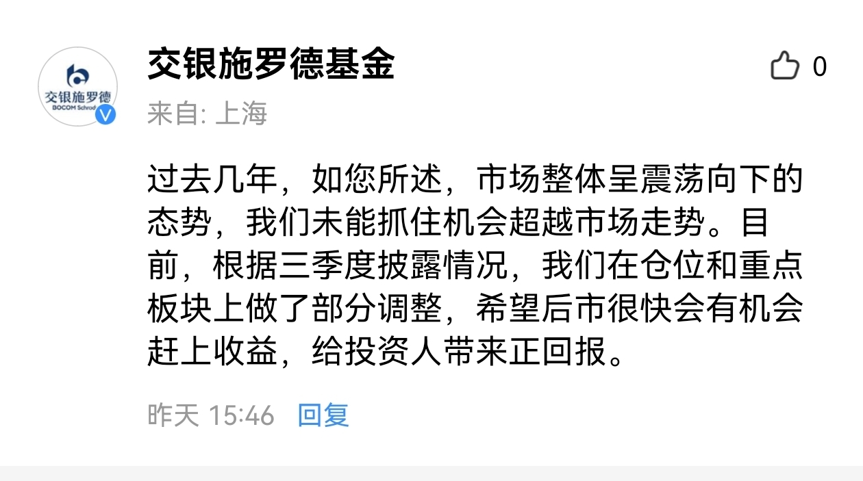 $交银新成长混合[519736]$ 对于贵司在评论区里“市场整体震荡向下”的表述,我十分震惊,无法认同。事实上,在你们口中“震荡向下”的市场里,众多基金净值翻倍,上证指数更是创下十年新高。如此波澜壮阔的结构性牛市,竟被你们总结为“震荡向下”?我的问题是:在这样明确向上的市场里,贵司是依据什么得出“震荡向下”的判断?这个有悖于事实的预判,是否正是导致仓位与板块调整连续失误、业绩大幅落后的根本原因?