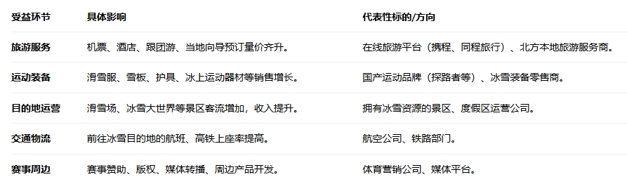 投资建议:可重点关注在冰雪目的地有资源布局的旅游服务商、具备技术含量的冰雪装备制造商,以及参与赛事运营和体育营销的相关企业。