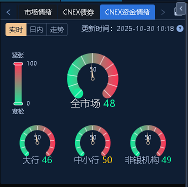 DR001报1.30%左右,DR007报1.49%左右,资金情绪均衡偏松(CNEX资金面情绪指数在48)
