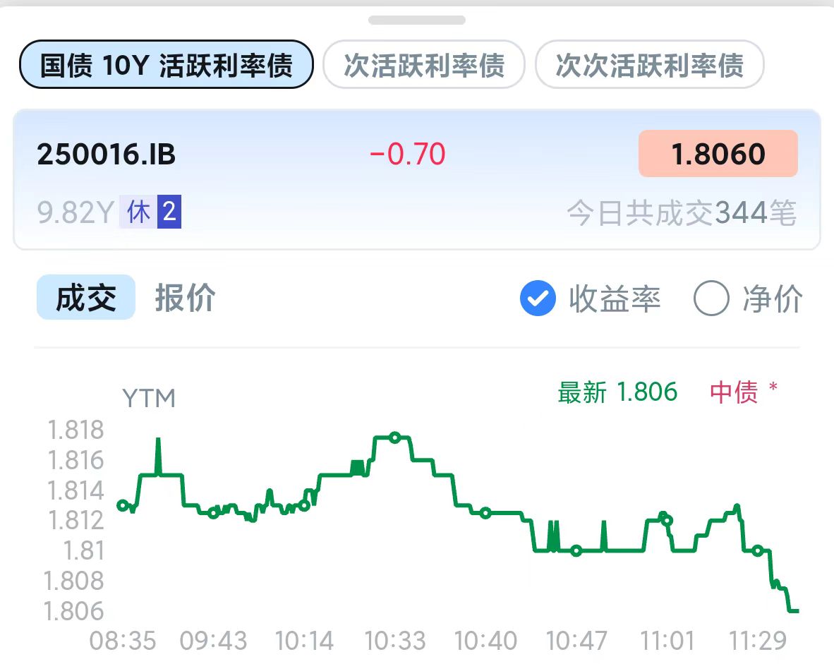 十年期国债收益率:1.806%,-0.7BP(国债收益率越跌,债市越涨)