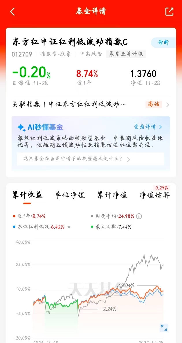 今天东方红中证红利低波动指数C估值继续上扬,它专注于稳定分红的企业,既能控制回撤