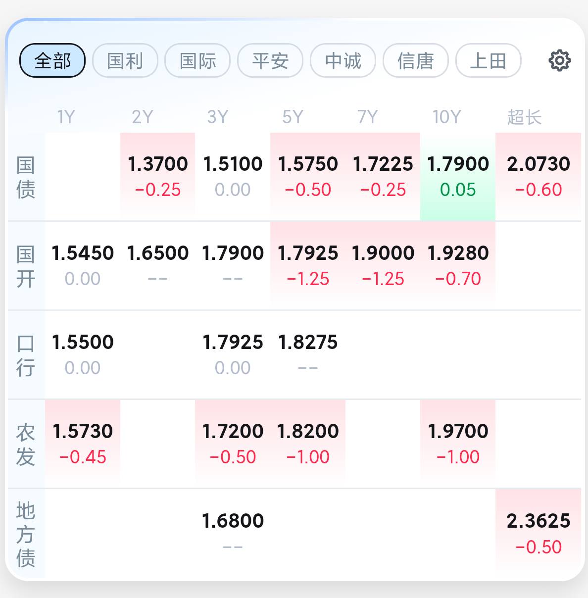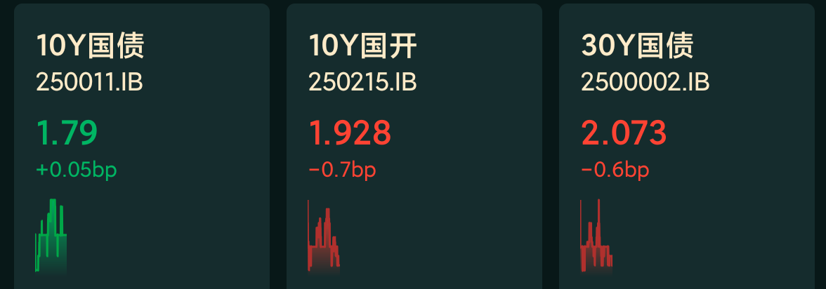 十年期国债收益率:1.79%,+0.05BP(国债收益率越跌,债市越涨)