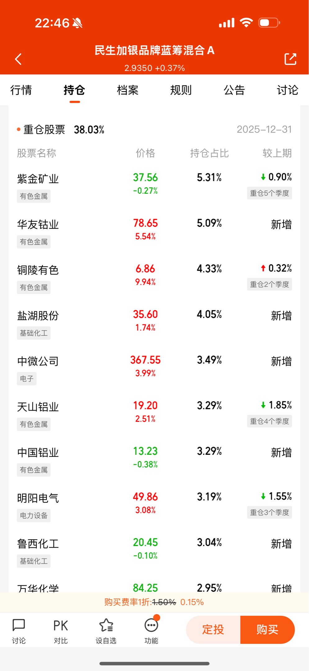 最近确实涨的不错,真难得,可今天怎么才0.37%?也差太多了,主要持仓又大调整了吗?今天整体有色也涨了接近3%啊!