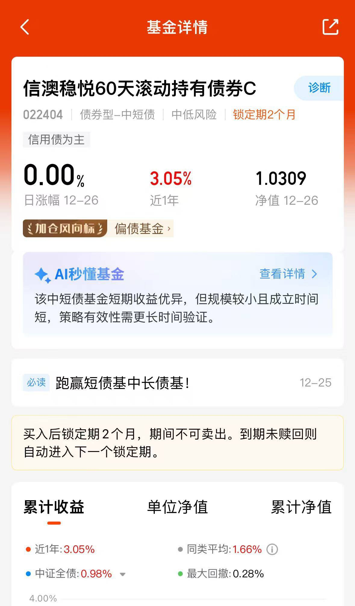 手里有点闲钱想增值?债市正当时信澳稳悦60天表现抢眼,涨幅3.05%吊打银行理财,今天我也跟投试试水 $信澳稳悦60天滚动持有债券C$