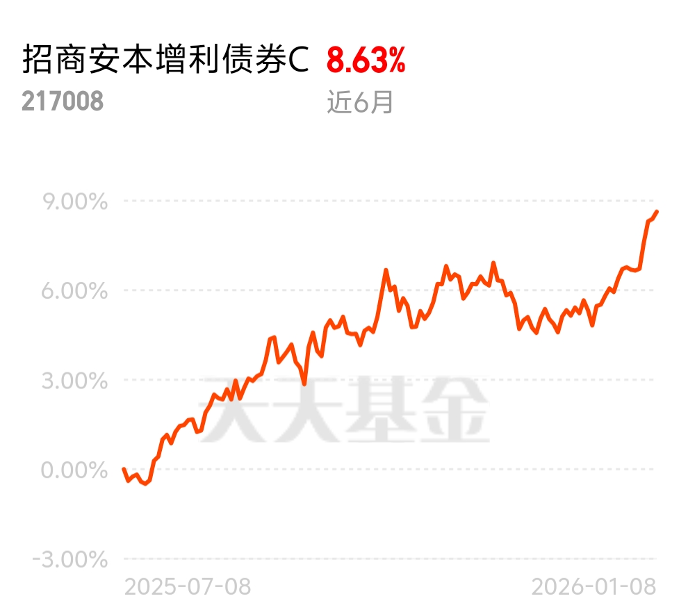 现在债市利率震荡,优质债基抗跌性强,$招商安本增利债券C$近6月8.63%,连涨