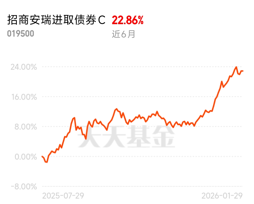 当下布局就得选稳中有进的,招商安瑞进取债券 C 就很合适,固收打底安全性拉满,固收 + 还带点弹性,近 6 月 22.86%,昨天没跌,基金经理有多年可转债经验,还提前控制了风险,避开了单一主题的风险$招商安瑞进取债券C$