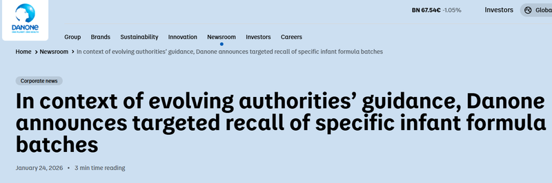 北京时间1月24日凌晨,达能官网发布预防性召回公告。 达能官网截图