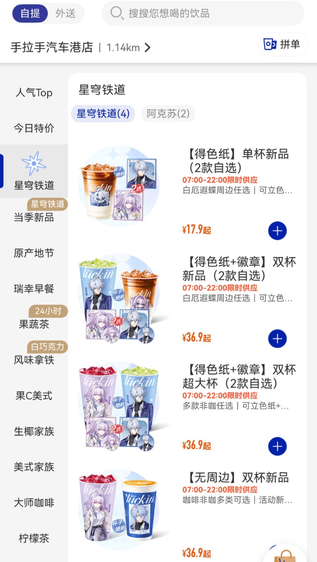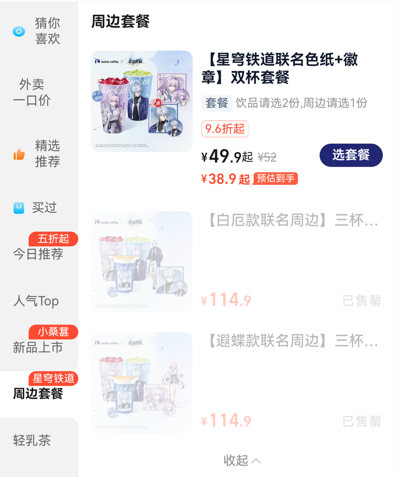 9月15日,瑞幸咖啡与《崩坏:星穹铁道》(以下简称“星铁”)展开联动,消费者购买瑞幸指定套餐,可获得该游戏联名周边,包括联名色纸、徽章、亚克力立牌、mini纸袋、摇摇乐挂件和冷变杯等。