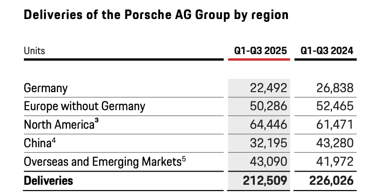 此外,区域市场销售疲软。今年前三季度,保时捷销量整体下滑6%至21.25万辆。其中,保时捷在德国市场销量同比下降16%至2.25万辆;欧洲市场(除德国外)同比下跌4%至5万辆;在中国市场,销量同比下降26%至3.2万辆。