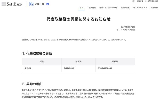 【软银董事长宫内谦将于4月1日起取消代表董事头衔】3月27日,软银官网宣布,公司