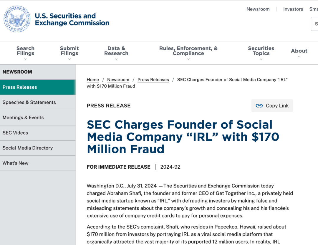 据披露,SEC向美国加利福尼亚州北区地方法院提起诉讼,指控Get Together Inc.(名为“IRL”的社交媒体公司)的创始人兼前首席执行官亚伯拉罕·沙菲对该公司的发展做出虚假和误导性陈述,从而欺诈投资者,并隐瞒他和他的未婚妻大量使用公司信用卡支付个人开支的事实。