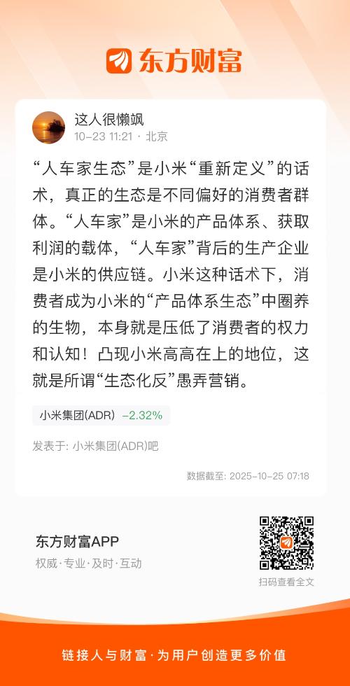 “人车家生态”是小米“重新定义”的话术,真正的生态是不同偏好的消费者群体。“人车家”是小米的产品体系、获取利润的载体,“人车家”背后的生产企业是小米的供应链。小米这种话术下,消费者成为小米的“产品体系生态”中圈养的生物,本身就是压低了消费者的权力和认知!凸现小米高高在上的地位,这就是所谓“生态化反”愚弄营销。