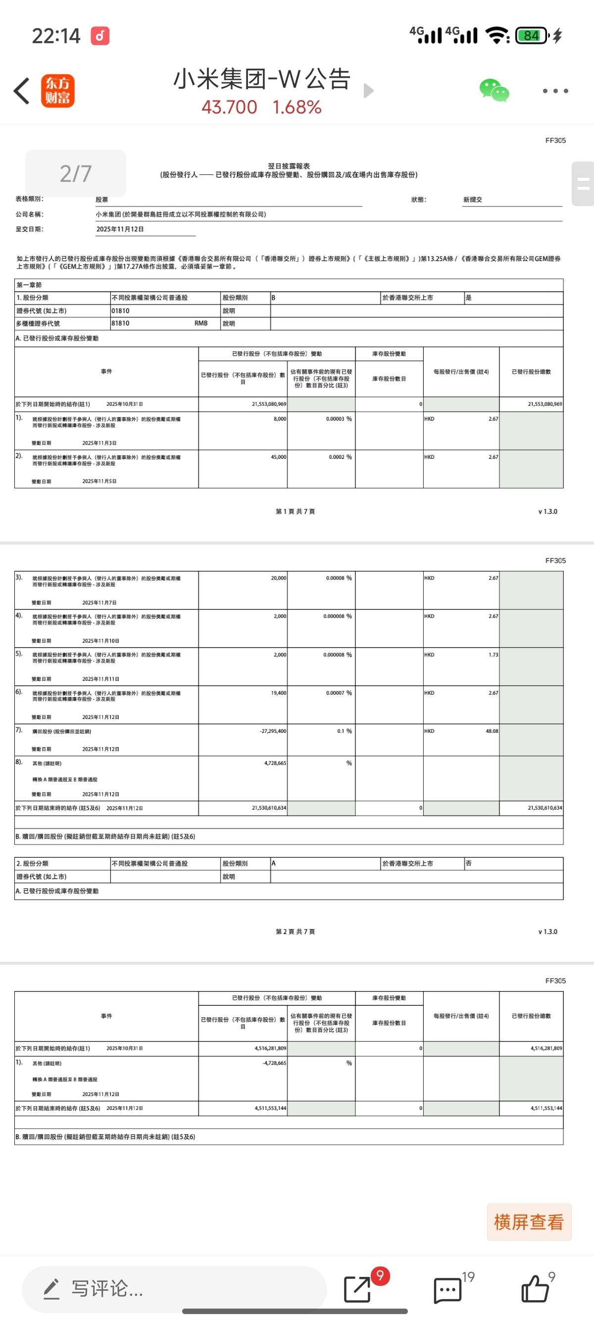 $小米集团(ADR)(OTCBB|XIACY)$ 今天小米发公告注销了2729万股,总值约12亿港币,现在还在静默期,希望财报过后再加油回购吧