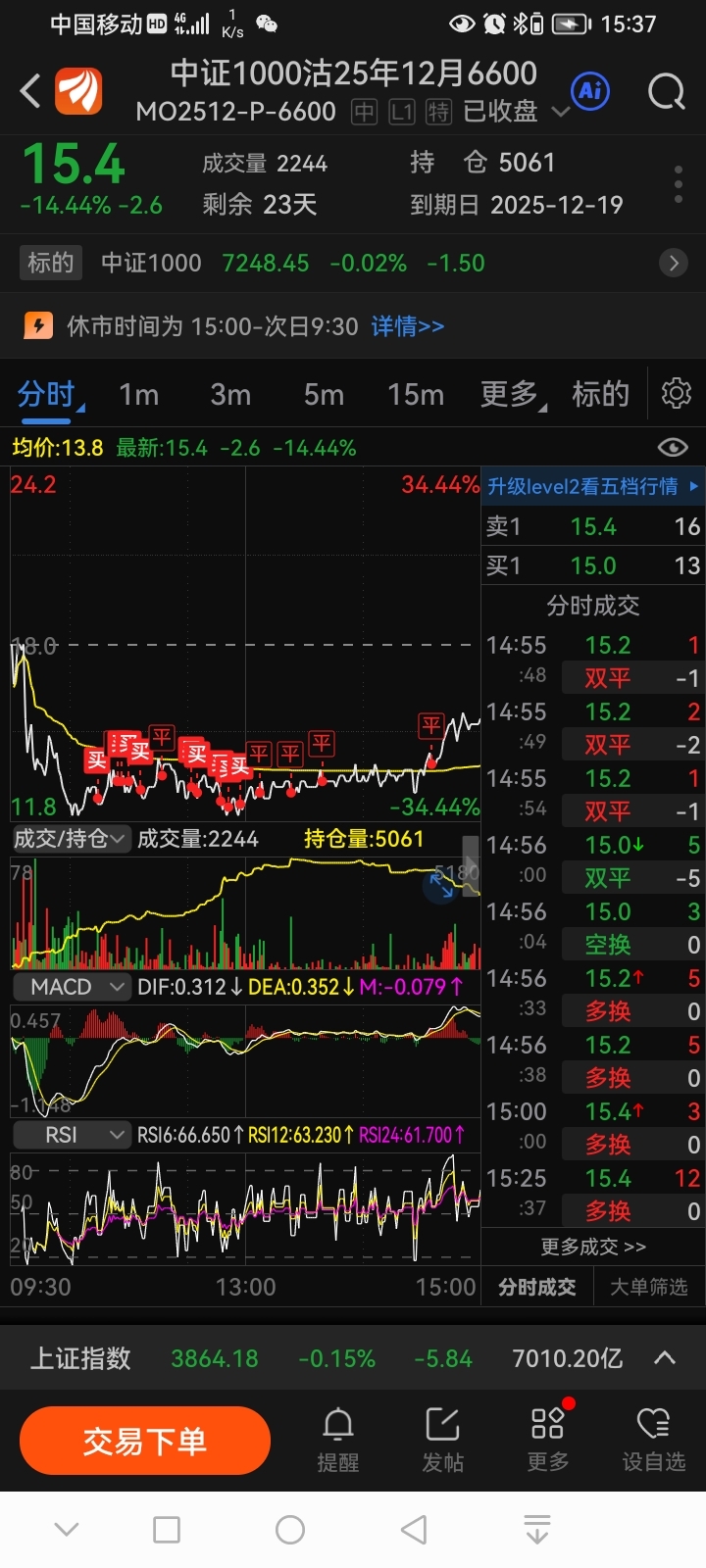 股指期权还是不能重点搞,手续费太高了,这样还亏。涨跌幅度还跟不上。以后重点只能做股指,一手23的手续费,来回46,如果买的多,方向又买错,那真的搞死人。