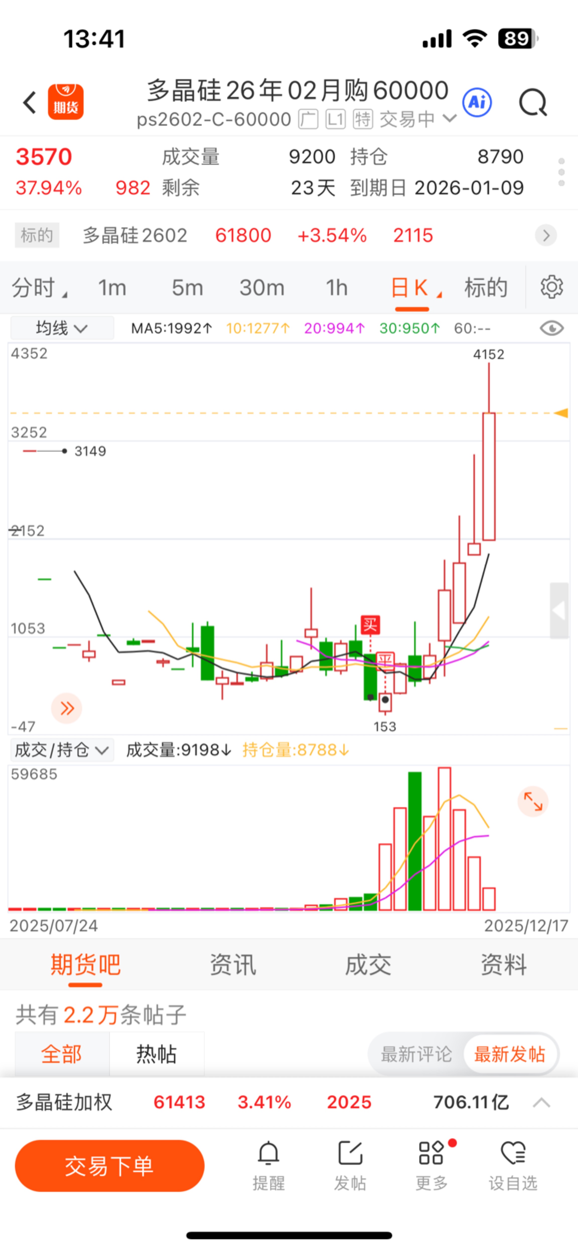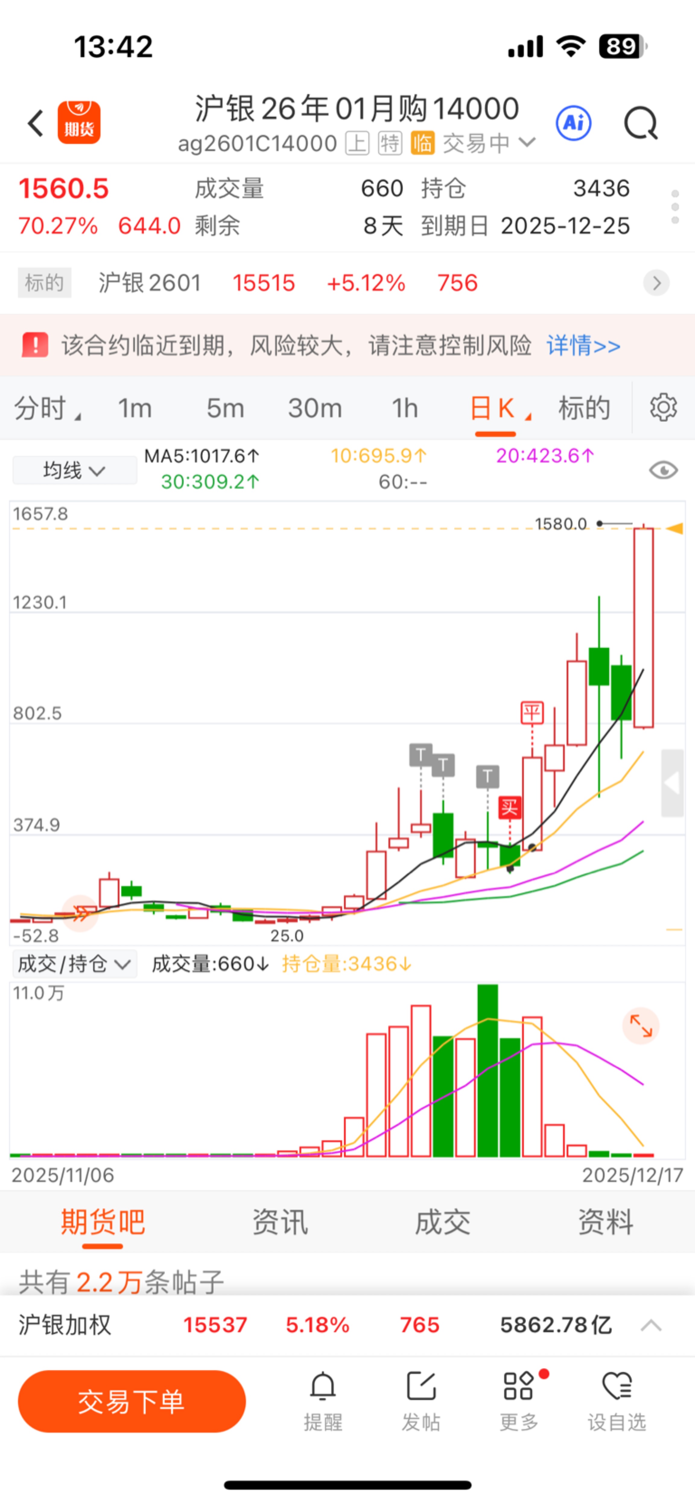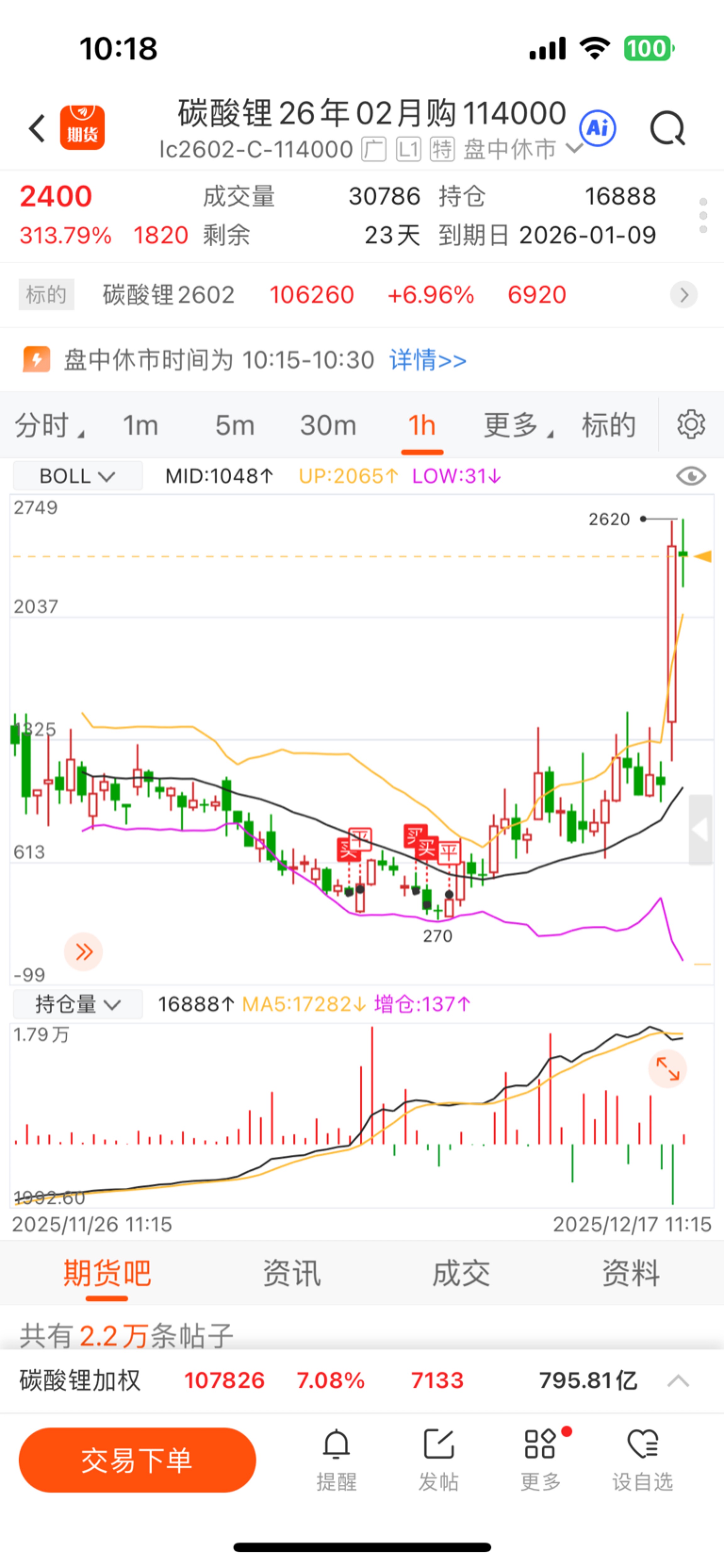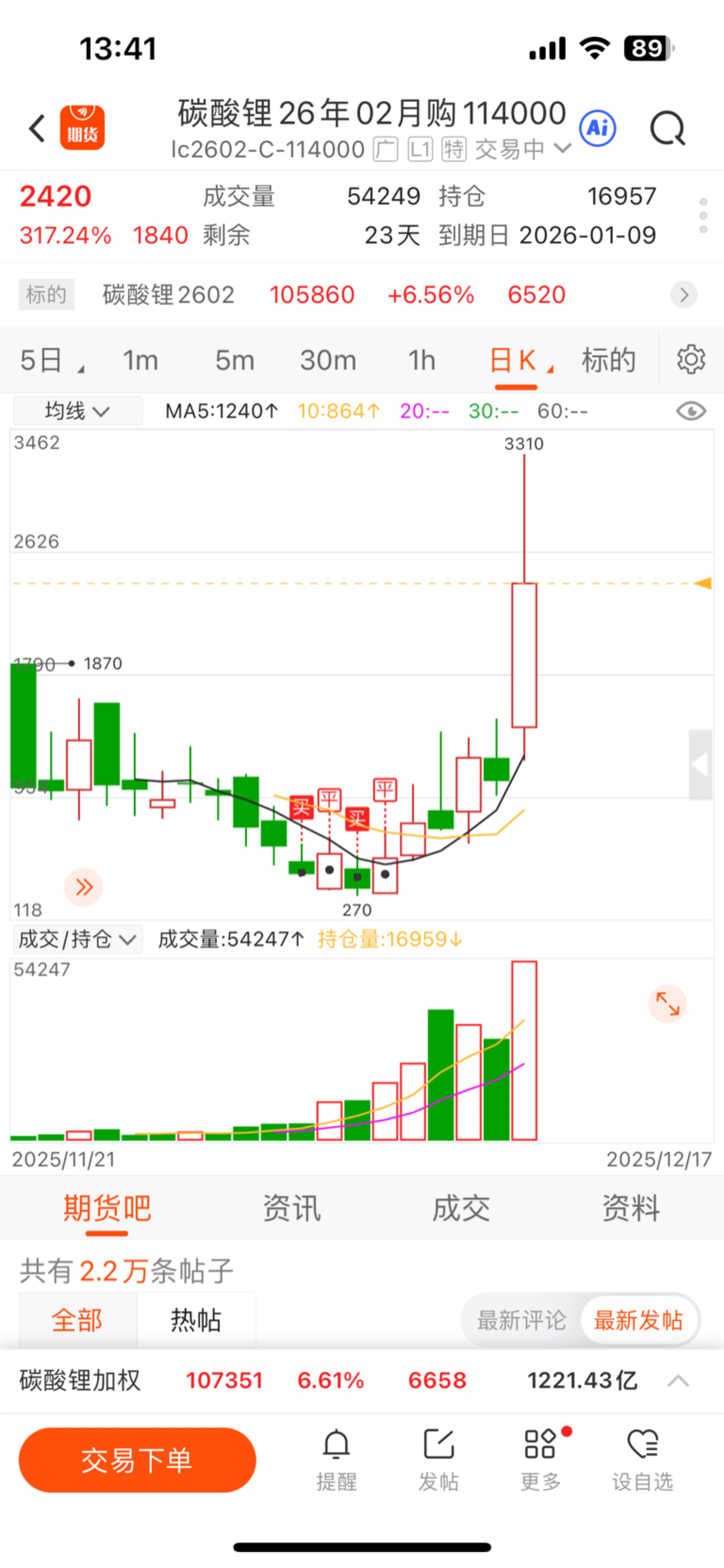 $沪铜26年01月购94000(SHFEOPTION|cu2601C94000)$ $沪银26年01月购14000(SHFEOPTION|ag2601C14000)$ $碳酸锂26年02月购114000(GFEXOPTION|lc2602-C-114000)$ 每一波操作都菜的抠脚