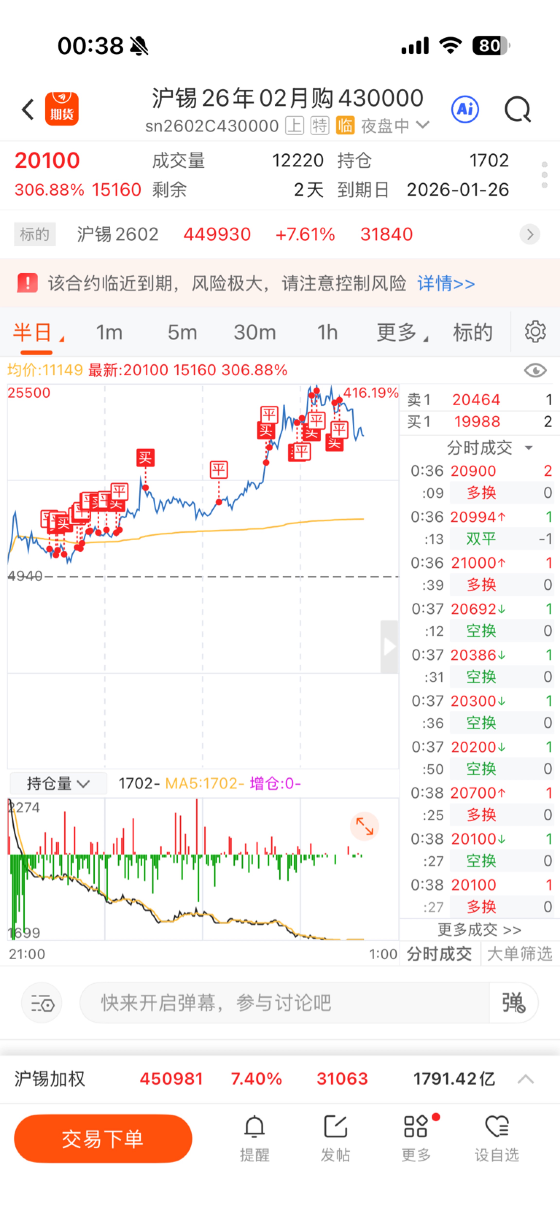 $沪锡26年02月购430000(SHFEOPTION|sn2602C430000)$ 坚守了一个星期,只是凭感觉它会涨,但是被腰斩过,没底气,频繁买卖。内心不够强大,不然一晚上多赚几万没问题的。算了,落袋为安,毕竟就剩下2天。