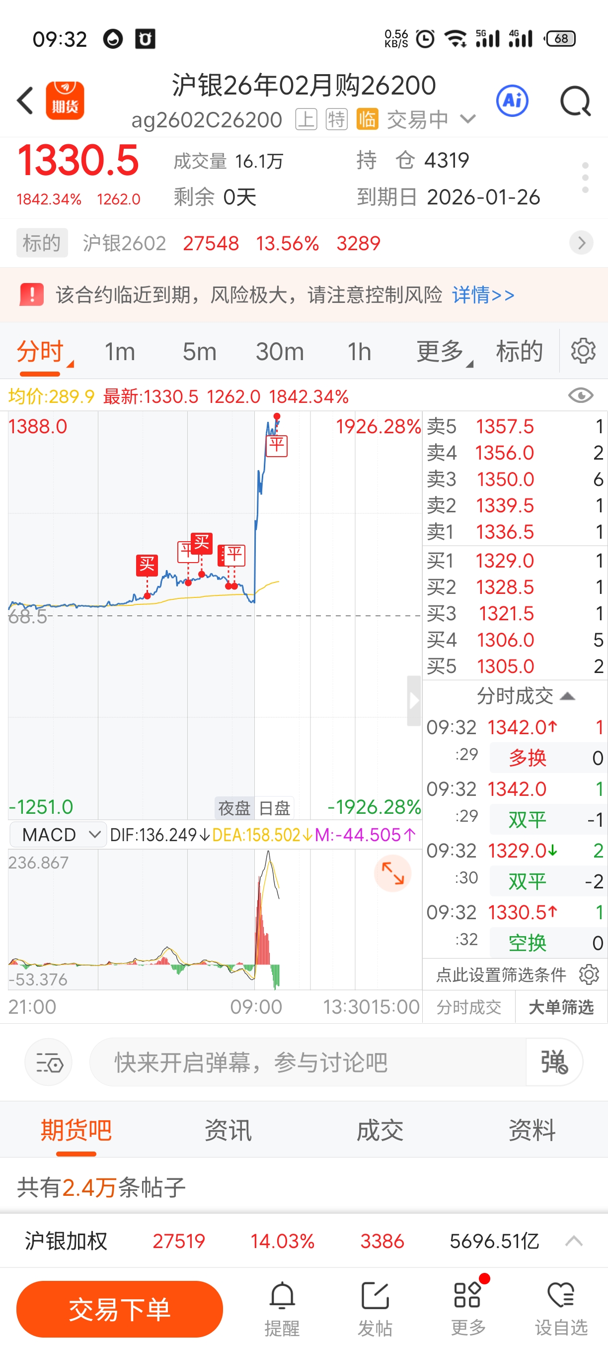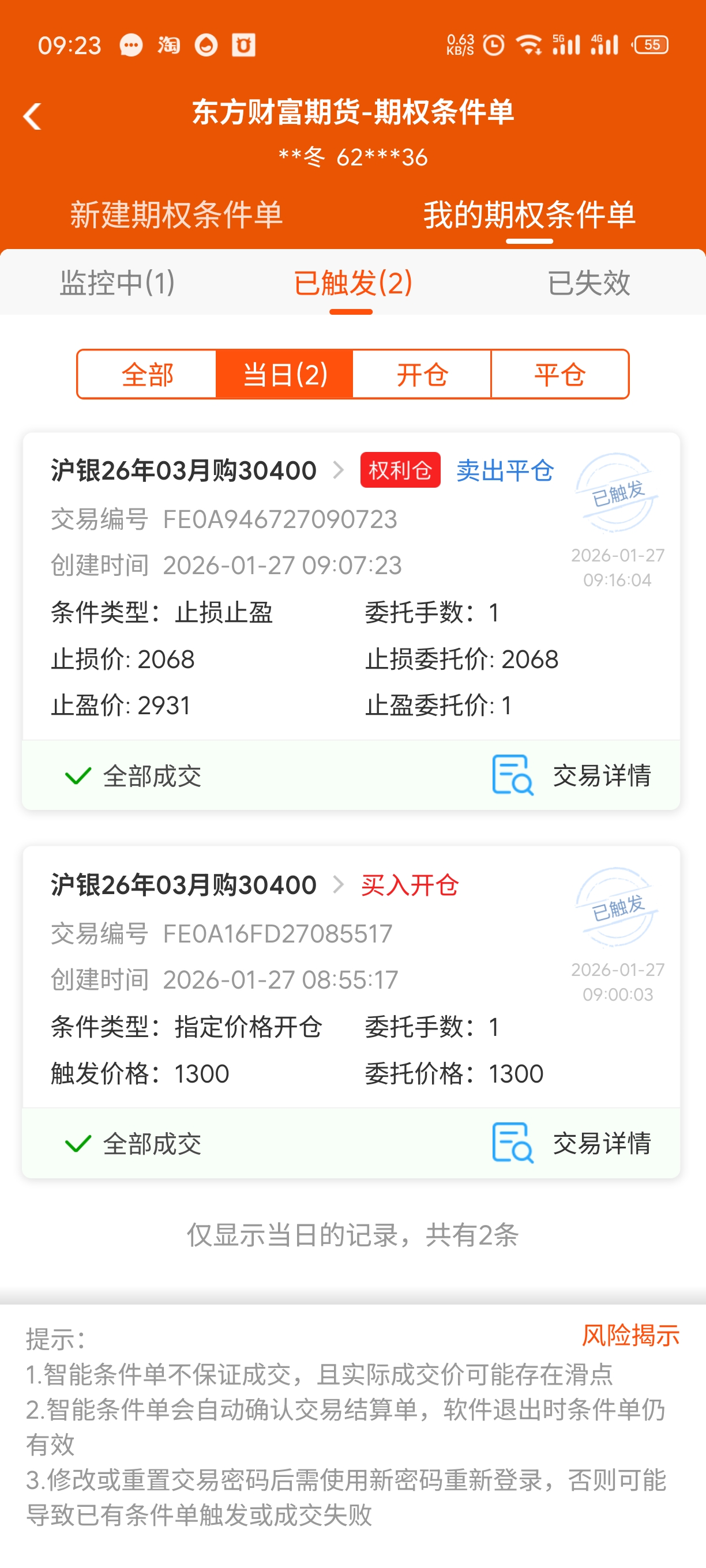 早上大概算了下沪银期权购30400期权跟随比约0.6, 根据外盘跌幅预算低开在1300~1258区间,于是就挂了两个条件单,1300成交了(比较幸运的是只有1300与1287成交了)随后一路飙升,我立即开启动态止盈(止损)与终极止盈(前高点),动态止盈它涨我加,预留100点上冲回落自动平仓! 遗憾的是2100未点确定就被前1068止损了,最后2071.5成交……小赚11482.5元