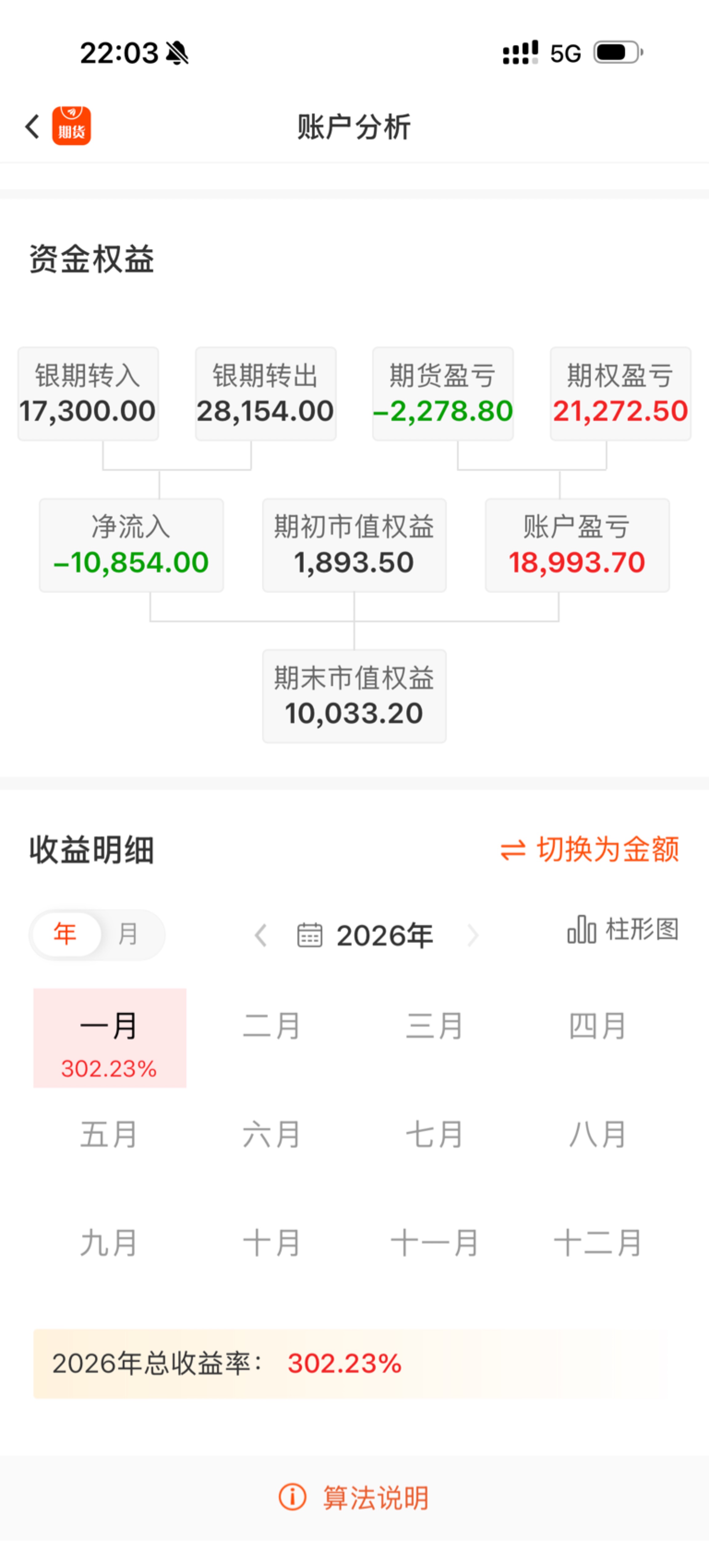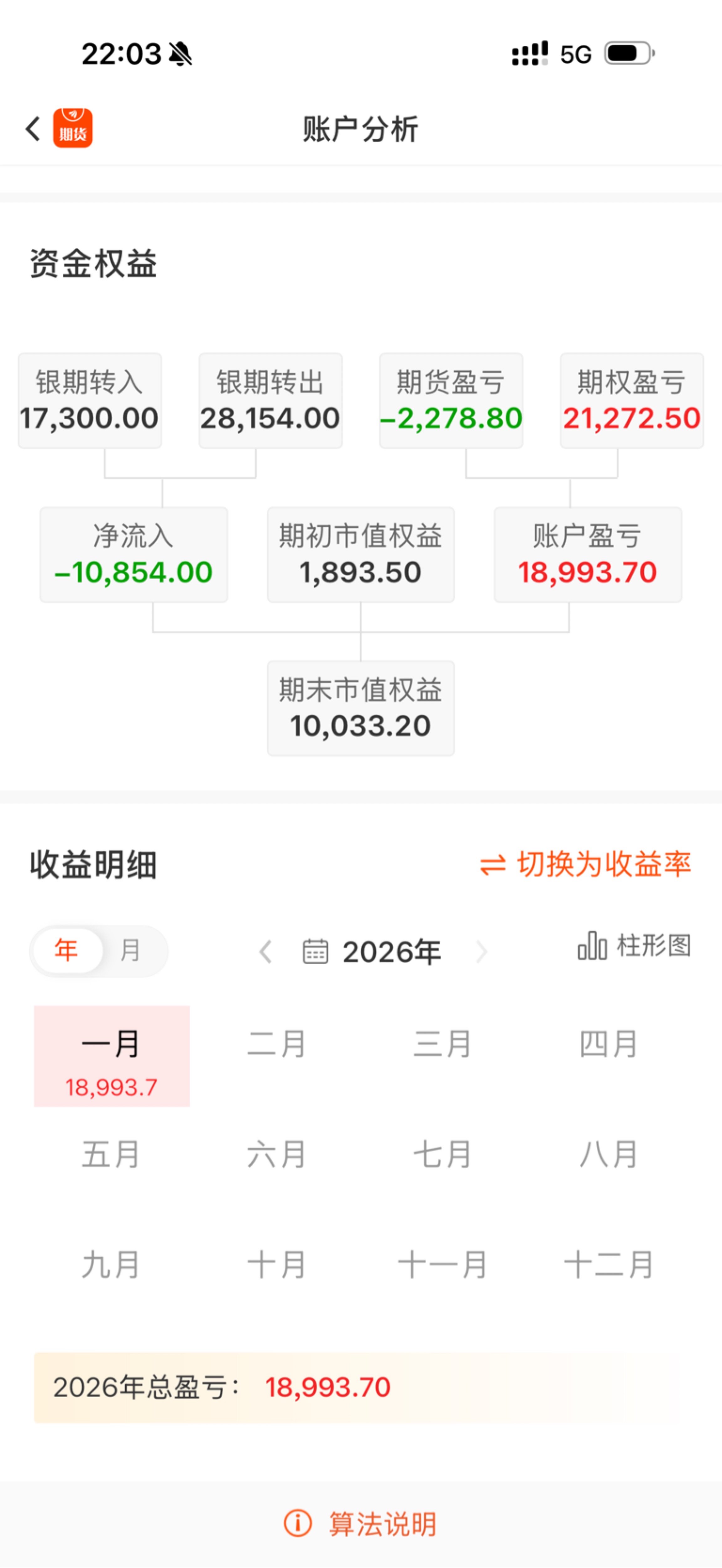 1月结束,我只做期权,12月底1500块起步的,月初1800块开始一直做,这收益还算可以,亏的唯一一次是丁二烯胶割肉了,说来惭愧,不然直接挣10多万了,暴富留给下次吧