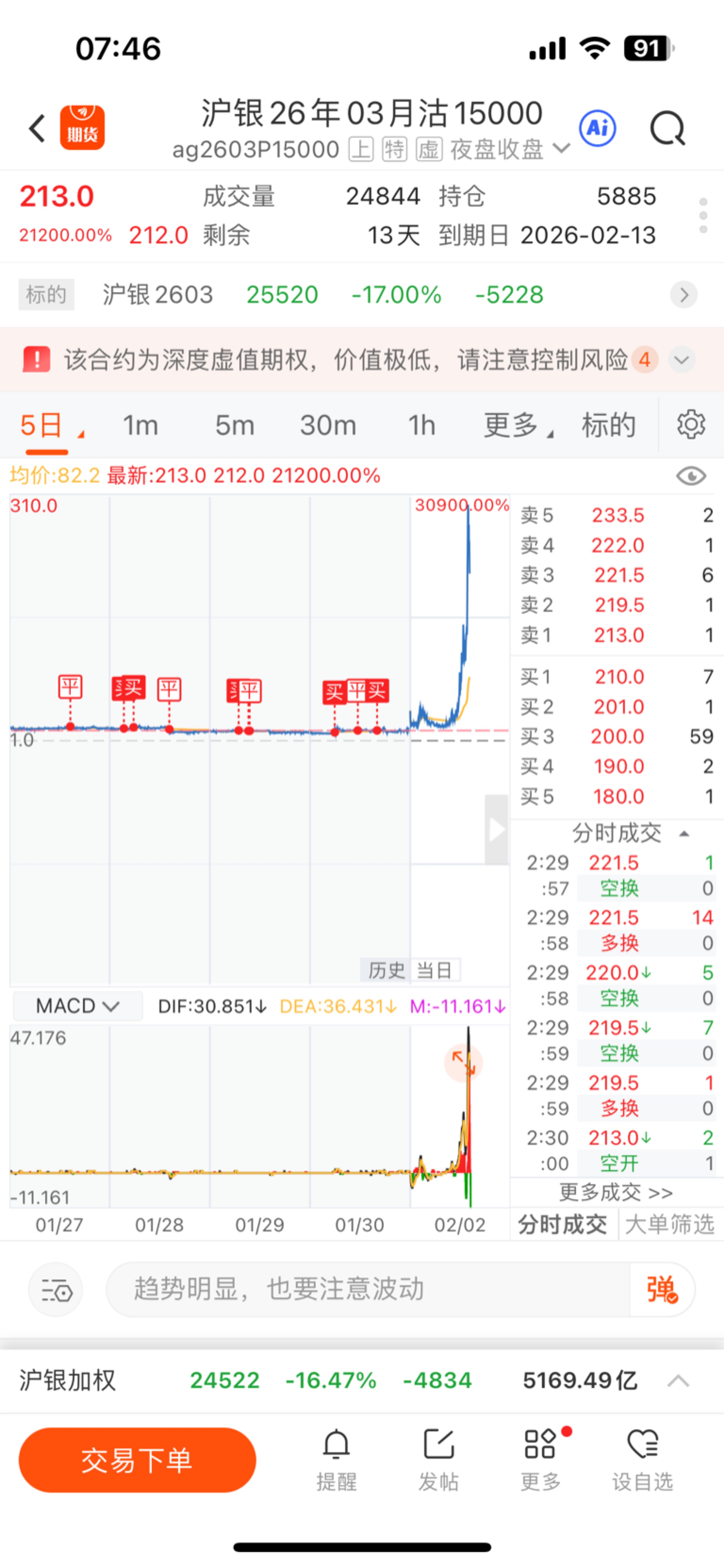 $沪银26年03月沽15000(SHFEOPTION|ag2603P15000)$ 哎!平常每次都是买50手守它,昨天晚上要去喝酒没时间看就只买了10手守它,结果它就起飞了。还喝醉了昨天晚上没平仓