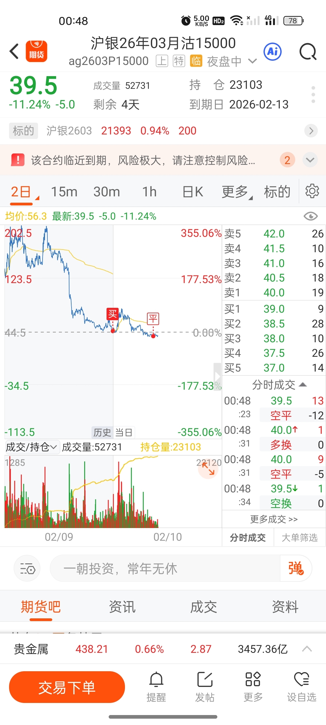 被教育了有点小难受,70多的时候没跑想着白银再跌个一两百点拿个一倍的,结果白银从400多拉到了600多拉个小坑,期权掉下来点犹豫了没跑,结果一路拉回来还创新高了没招了小亏离场了