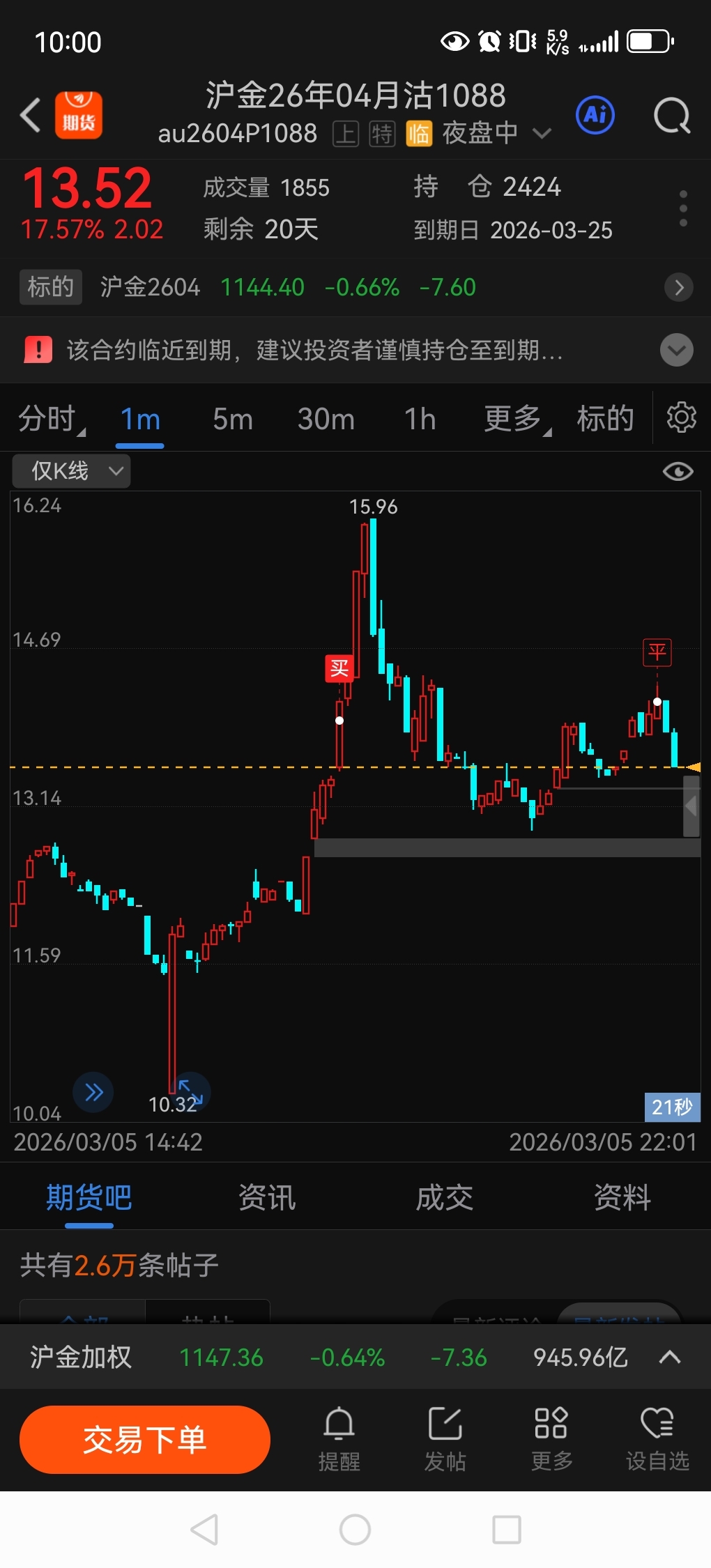 刚才没管住手,又碰了黄金,我承认我真的干不过它,跟外盘每一分钟都一样的走势,你完全没办法看开盘15分钟成交量去判断走势,每一分钟都被动的跟风外盘,失望透顶