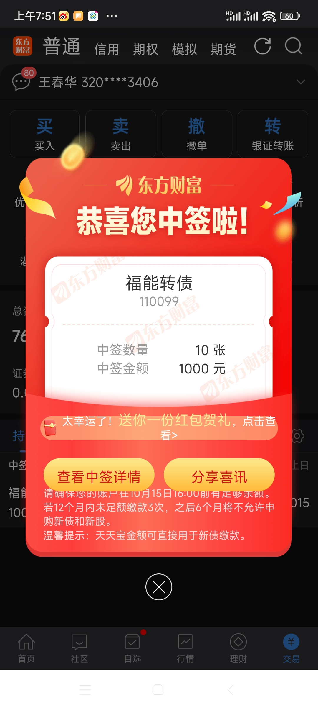 $福能转债(SH110099)$ 今年第一次中可转债,越来不好中了。