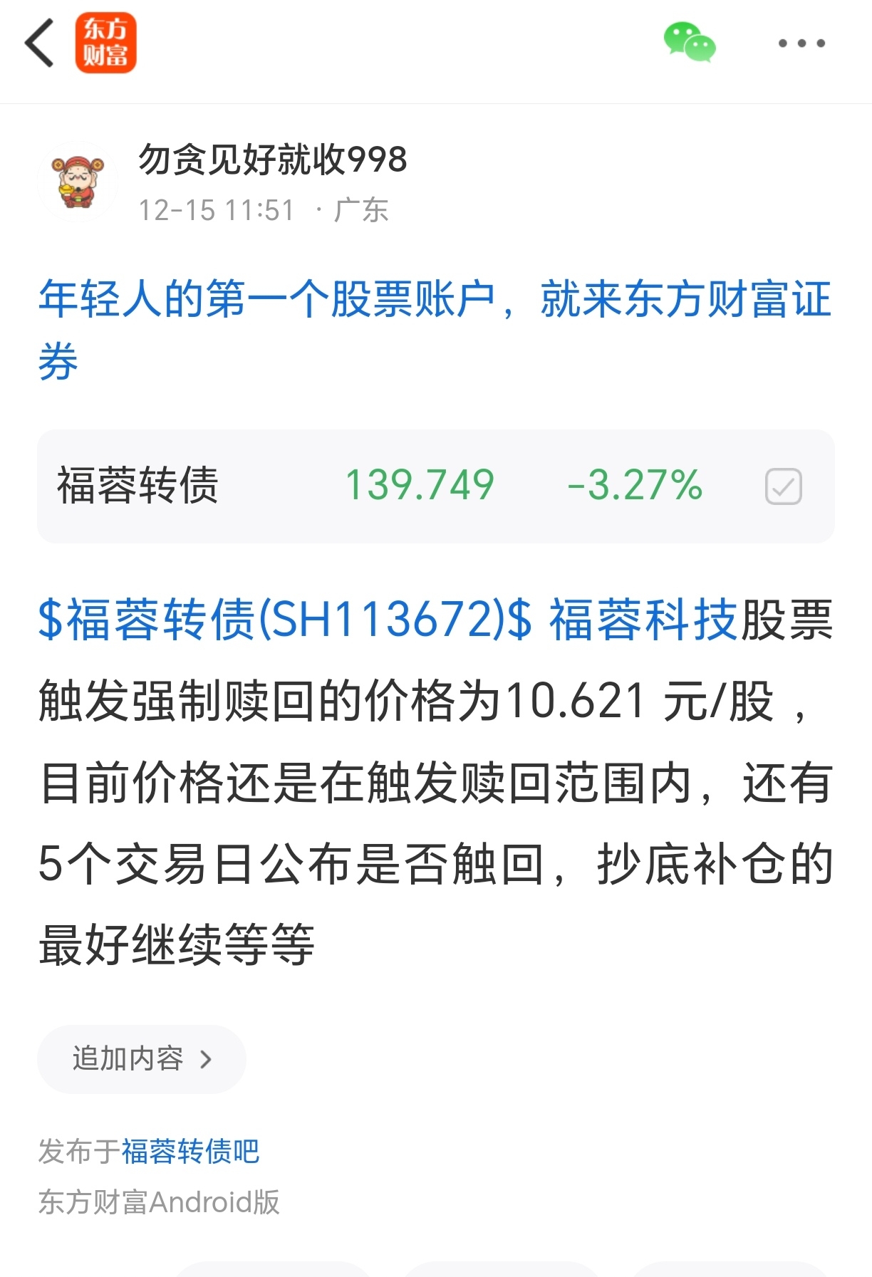 $福蓉转债(SH113672)$ 化债的一年击鼓传花的游戏,福蓉我在12月2号开始一直提醒走的是化债模式,不信邪的还有那么多人往里冲,模式和新化,英搏很像,新化一路砸到赎回,一点反上的余地都没有,英搏目前跟新化差不多,现在看福蓉接下来会不会和他两一样一路砸到赎回拭目以待