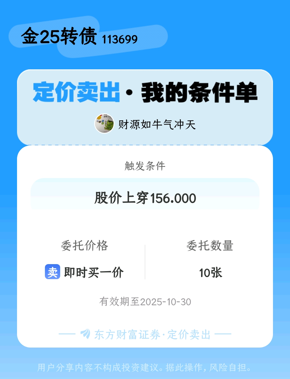 #条件单交流# #定价卖出晒单# 一位股神设置了一个定价卖出条件单,接下来就是见证奇迹的时刻~$金25转债(SH113699)$
