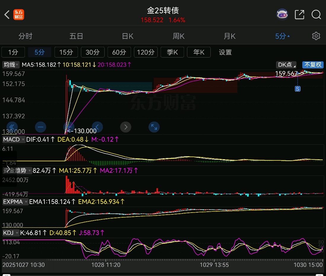 ——我实盘的股票虽有A股、港股通及新三板,但最近几年总体只围绕着低风险或无风险套利主线进行:即潜伏抢权配债套利标的股、要约收购及私有化标的股以及付利息相对较高的股票。交易过程中择机做下外盘的Etf及场内Reits;可转债基本上是在配债中留一只在一定时期内反复做T:如前段时间主要做恒帅转债,近期重点在$凯众转债(SH113698)$ ——配债上市时到本周的120分钟交易图