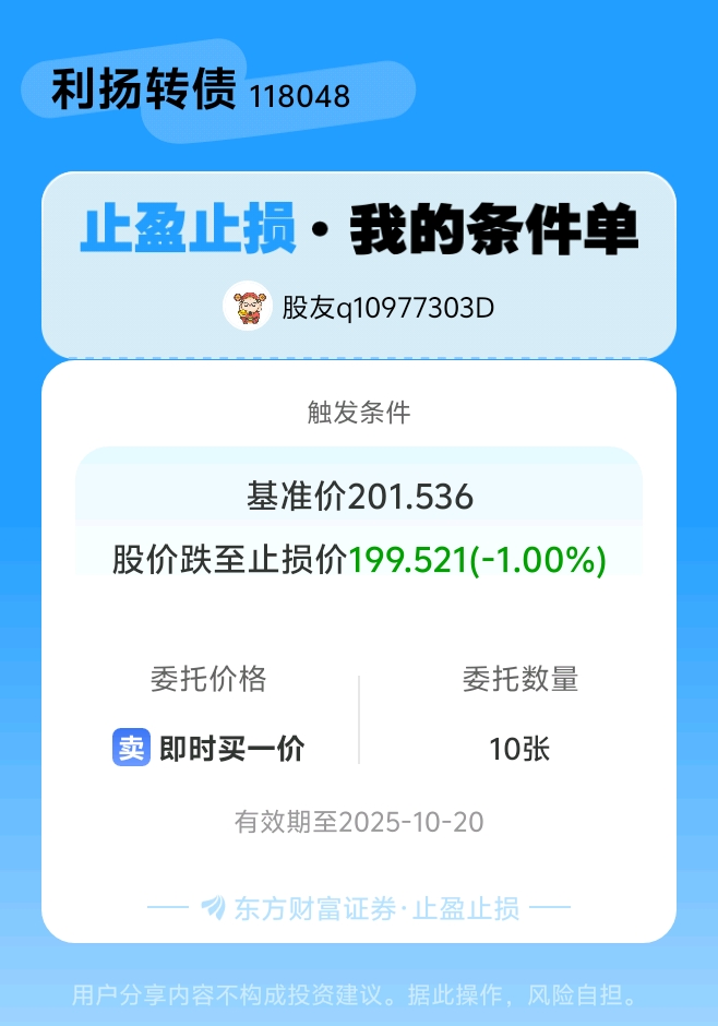 #条件单交流# #止盈止损晒单# 一位股神设置了一个止盈止损条件单,接下来就是见证奇迹的时刻~$利扬转债(SH118048)$
