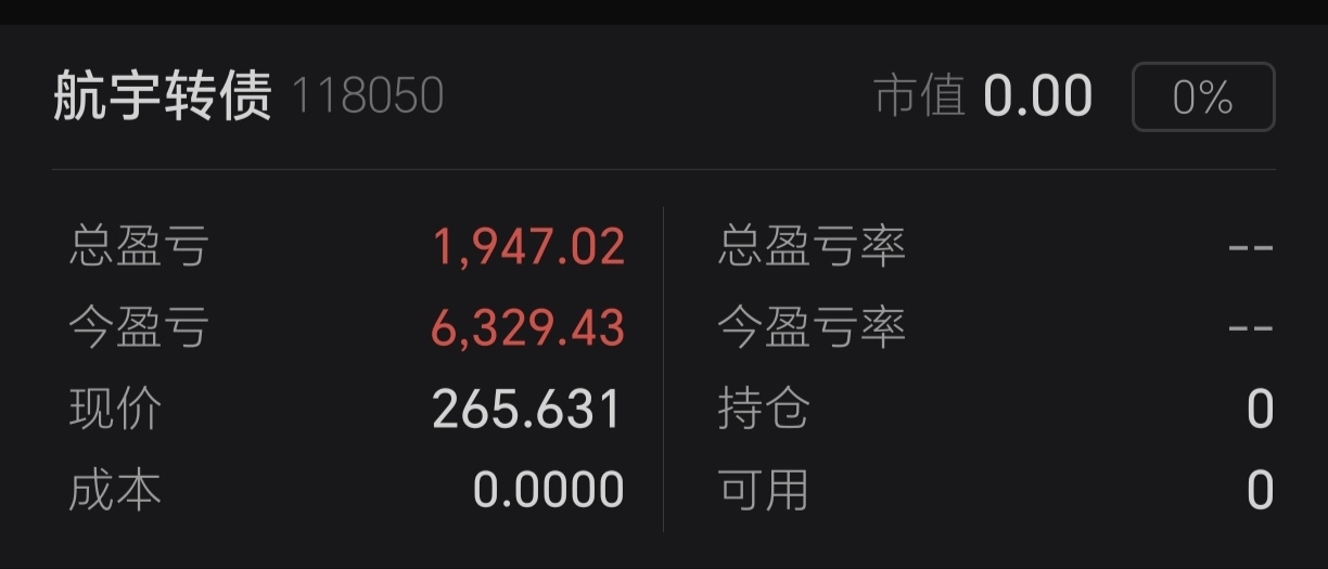 $航宇转债(SH118050)$ 266.5清仓,回本,还吃肉了,上周290进了200张,以为要挂在高高的月空过年了,还好今天一早回弹全部清仓,反复做了6次T真不容易,以后单边严重下挫的债再也不碰,想抄底差点被抄家