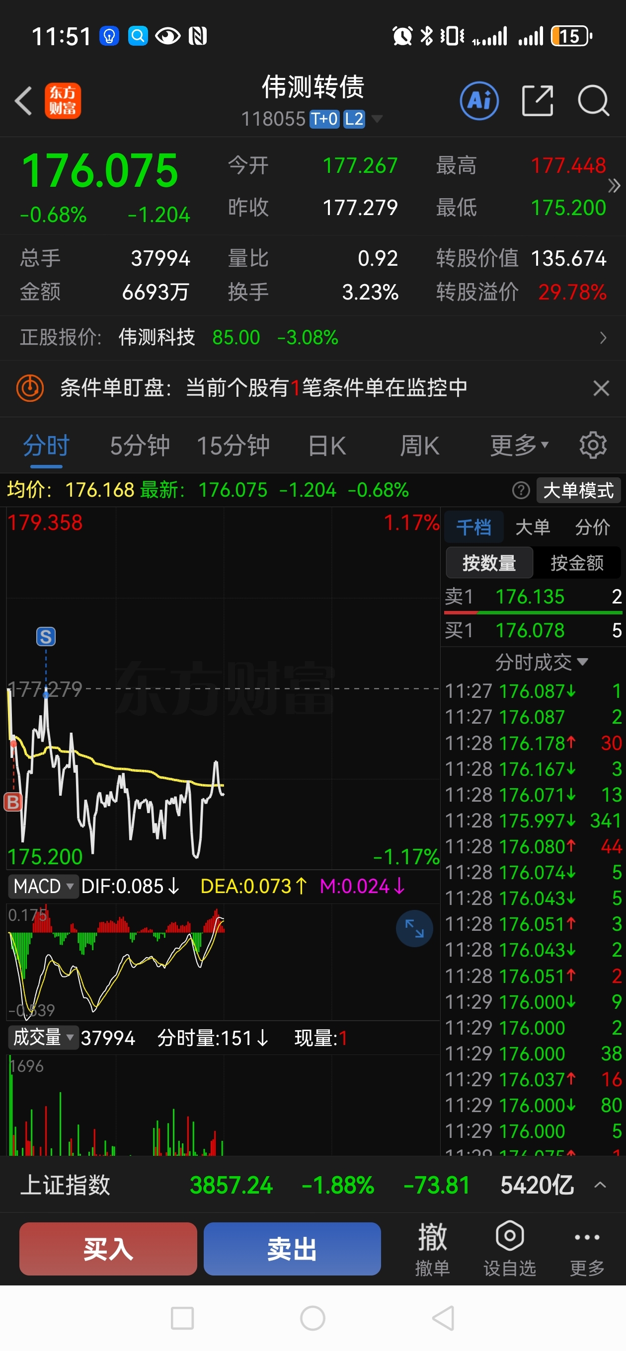 $伟测转债(SH118055)$ 今天下班很早!然后卖的位置也还可以!不贪