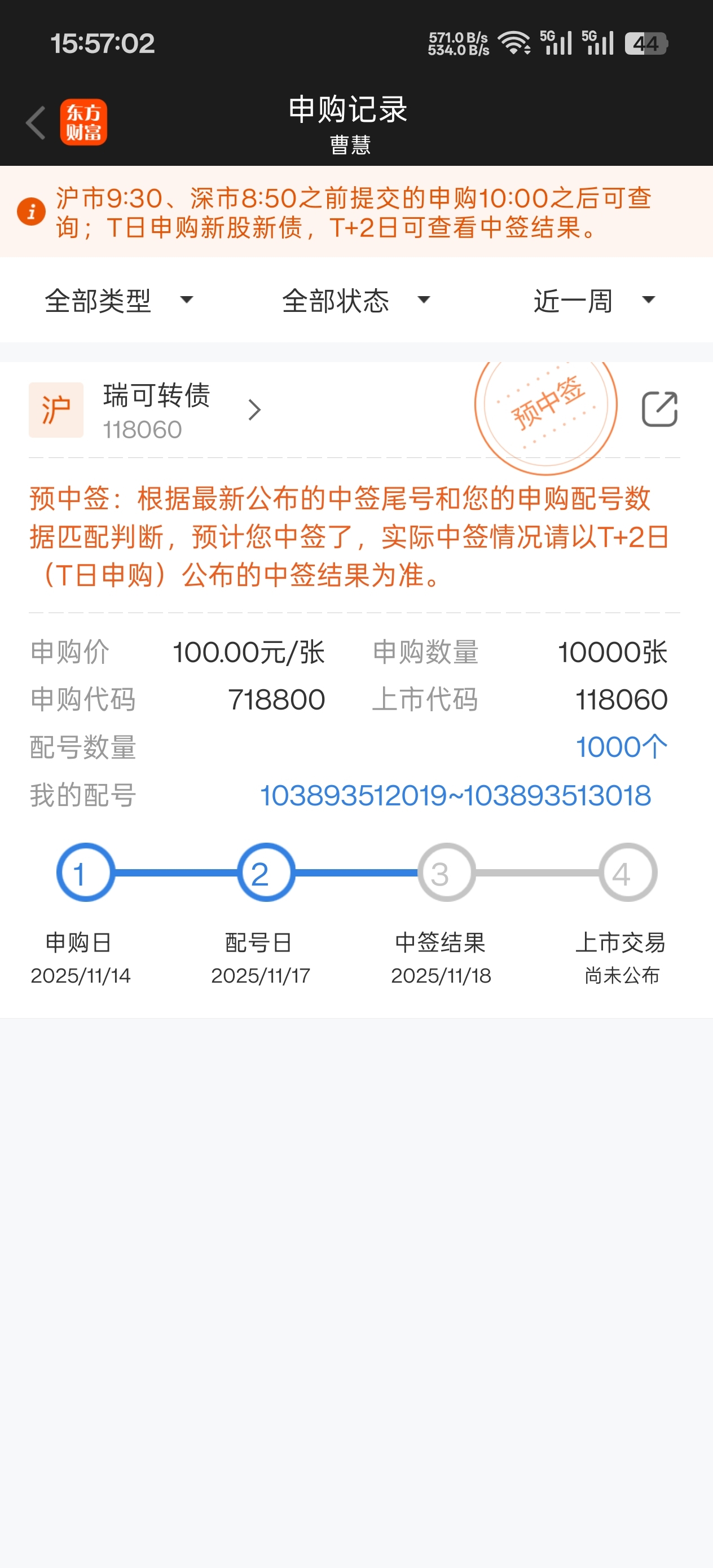 $瑞可转债(SH118060)$ 终于中了一签