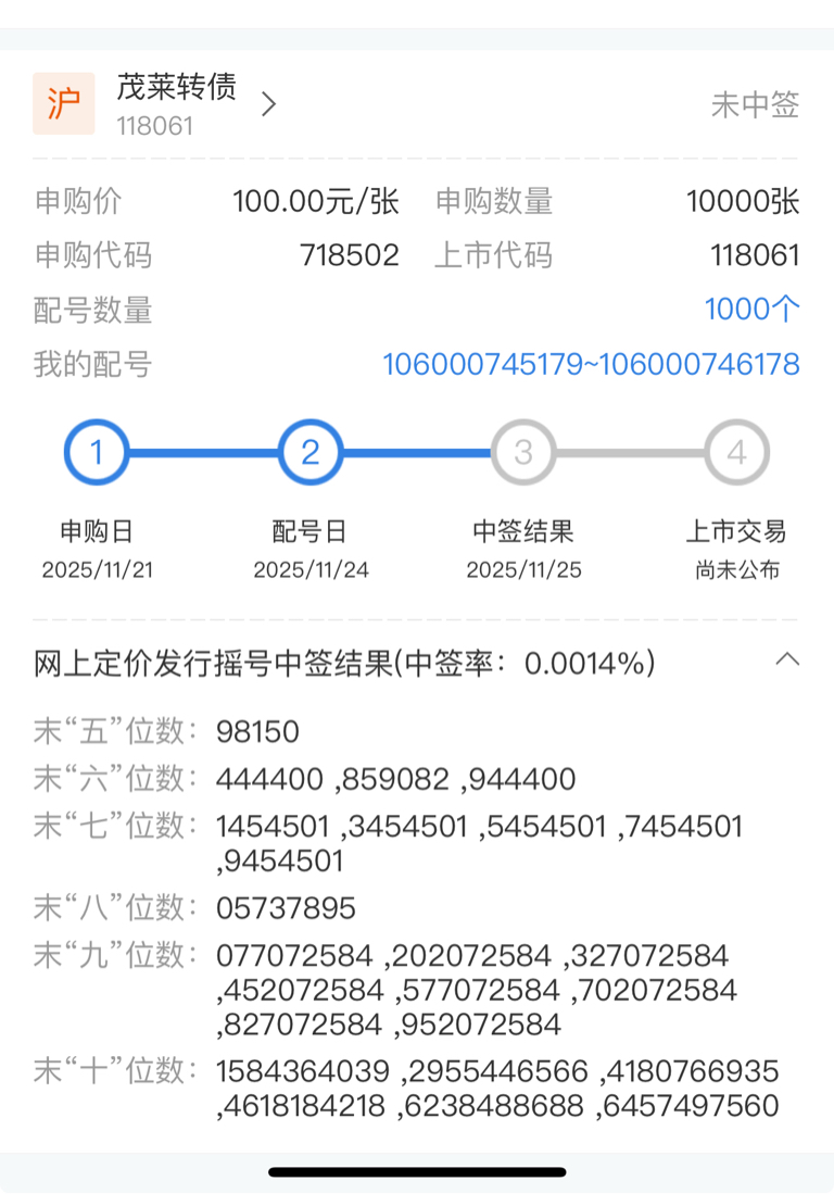 $茂莱转债(SH118061)$ 未中签呵呵