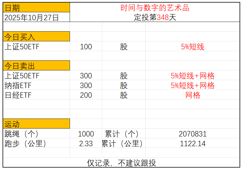 运动与投资第348天2025年10月27日今日定投:上证50ETF买入100股上