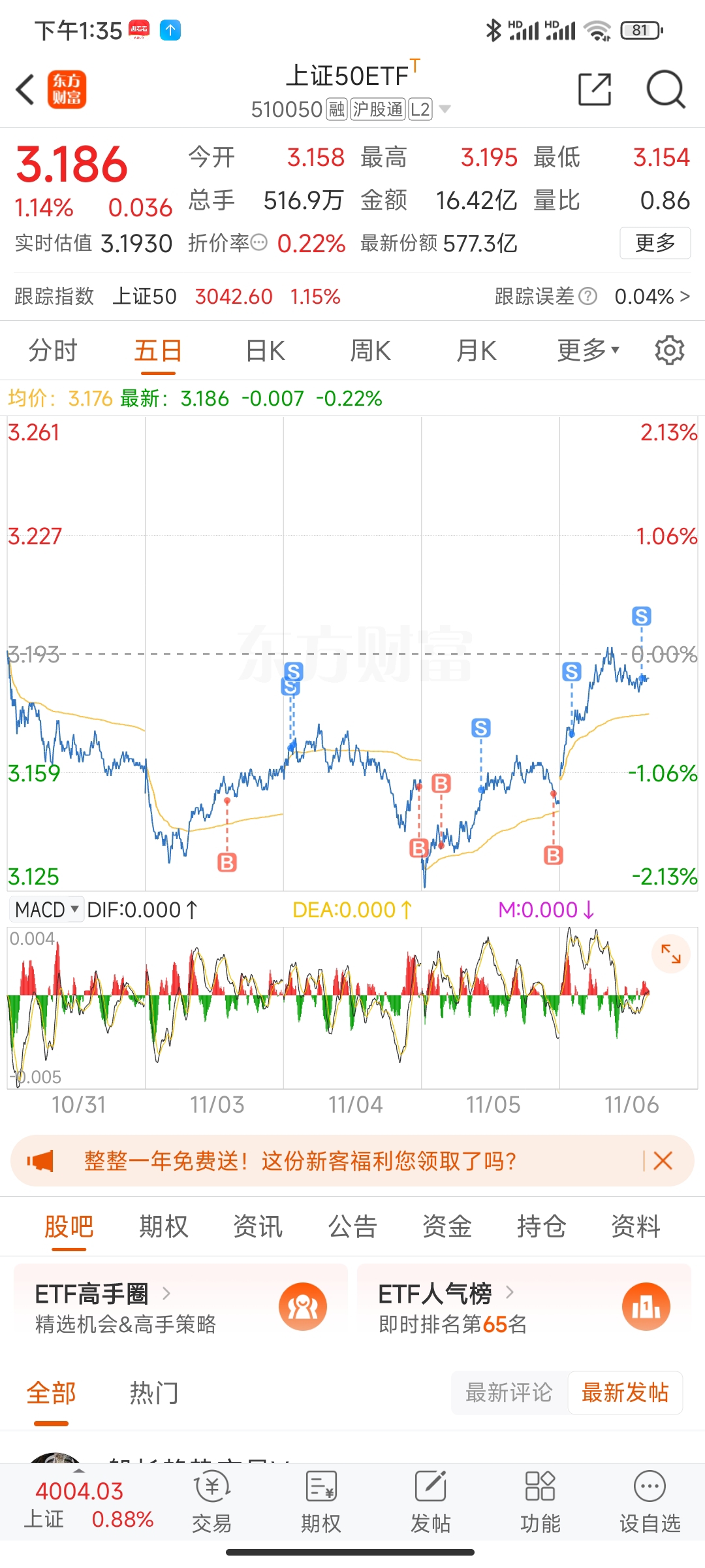 $上证50ETF(SH510050)$ 出了,获利2个点左右!知足了