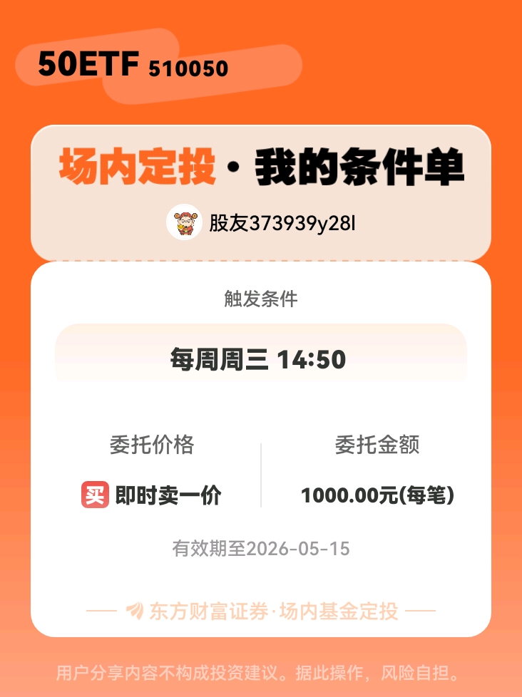 #条件单交流# #场内定投晒单# 一位股神设置了一个场内基金定投条件单,接下来就是见证奇迹的时刻~$50ETF(SH510050)$