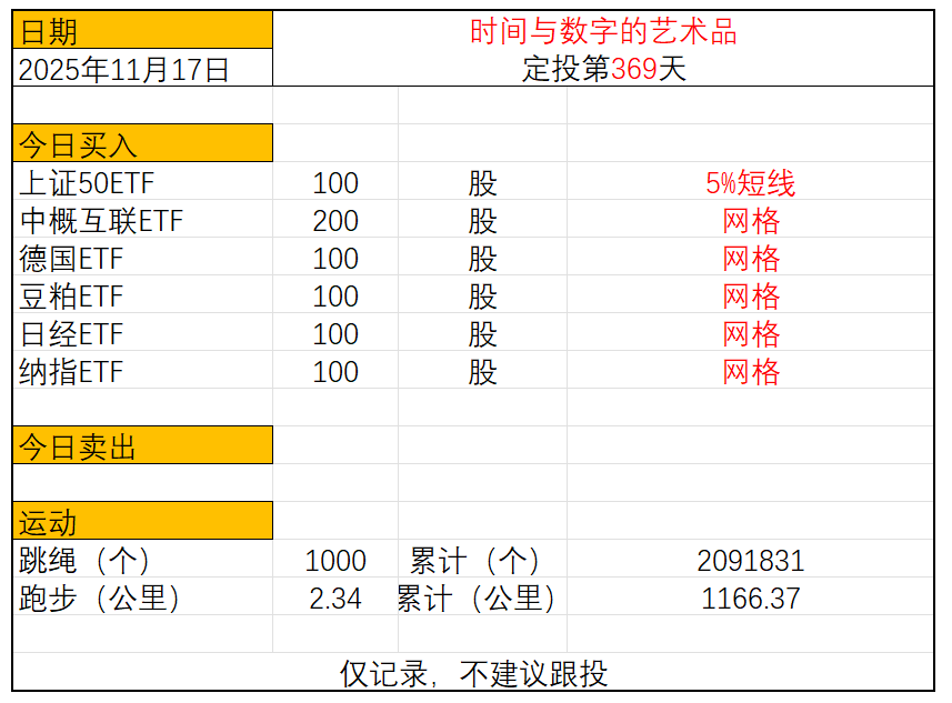 运动与投资第369天2025年11月17日今日定投:上证50ETF买入100股中