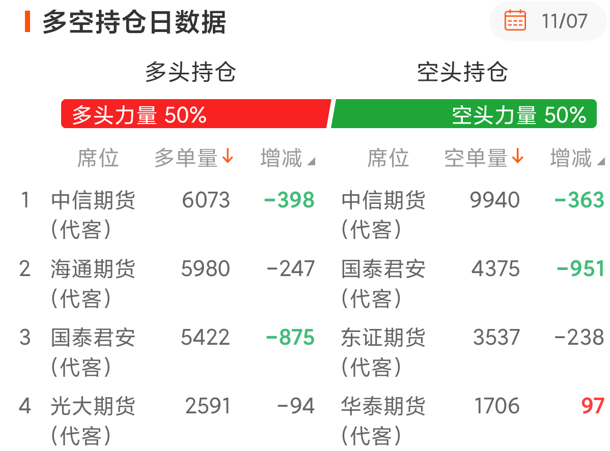 从十一月期的沪深300期指数据来看,中信席位的多头减持了多单398手,空头减持了空单363手,对冲之后多头主力减持的多单量更多,短期有压力。