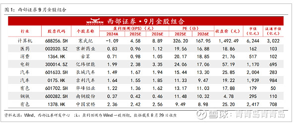 基于以上配置策略,2025年9月金股组合推荐如下:寒武纪(计算机)、京新药业(医药)、古茗(消费)、亿纬锂能(电新)、长城汽车(汽车)、吉利汽车(汽车)、华峰铝业(有色)、南钢股份(钢铁)、中国宏桥(有色)。