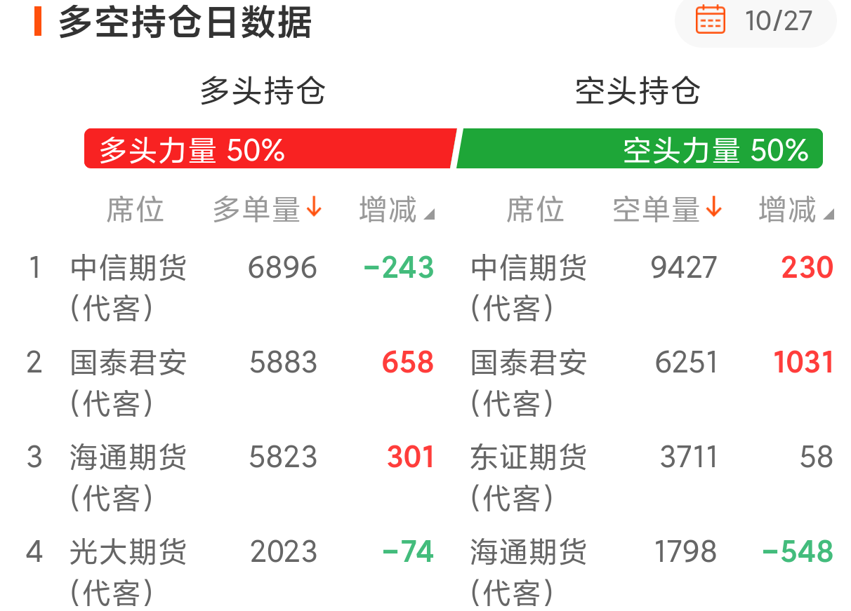 从11月期沪深300的期指数据来看,中信席位的多头资金减持了多单243手,空头资金增持了空单230手,短期多头示弱,空头小幅度发力,短期的压力增加。