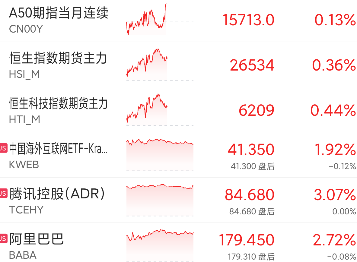 晚盘美股中概股的表现也不错,腾讯控股大涨超3%,阿里也涨超2%,已经连续上涨几个交易日了,趋势状态还不错,就看本周整体的持续性如何了。