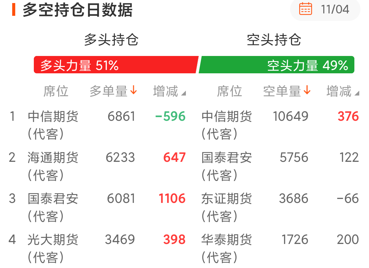 从11月期的沪深300期指数据来看,中信席位的多头资金减持多单596手,空头资金增持空单376手,对冲之后短期的压力有所增加,需要小心。