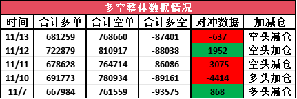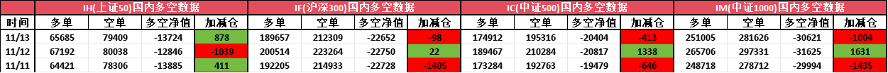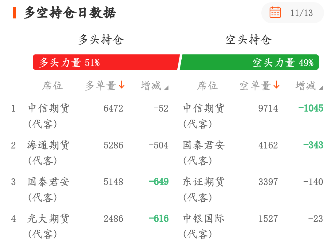 从11月期的沪深300期指数据来看,中信席位的多头减持了多单52手,空头减持了空单1045手,对冲之后空单大幅度离场,空头压力减小,走好的概率增加。
