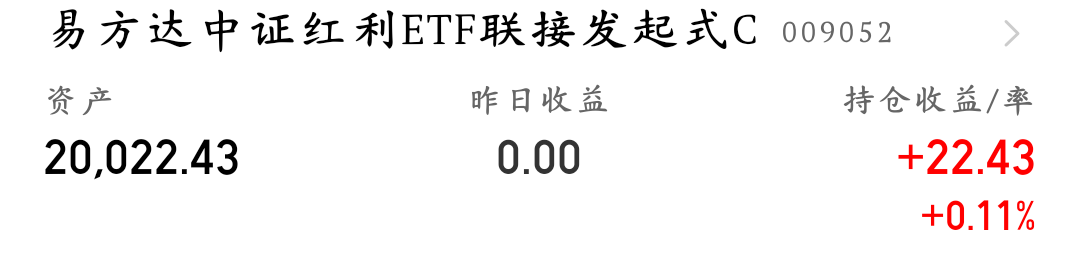 另外布局的 $易方达中证红利ETF联接发起式C(OTCFUND|009052)$今天也继续上涨了,这只基金股息率稍低于港股红利,但波动更小,表现更稳,且年年分红,是不错的压舱石。今天的表现比港股红利好一些,我都有布局,两市的机会都不错过。